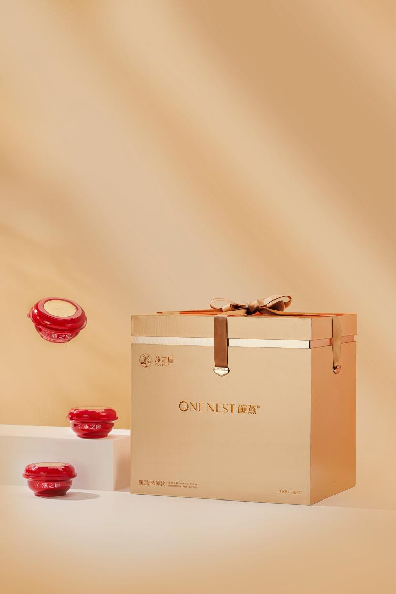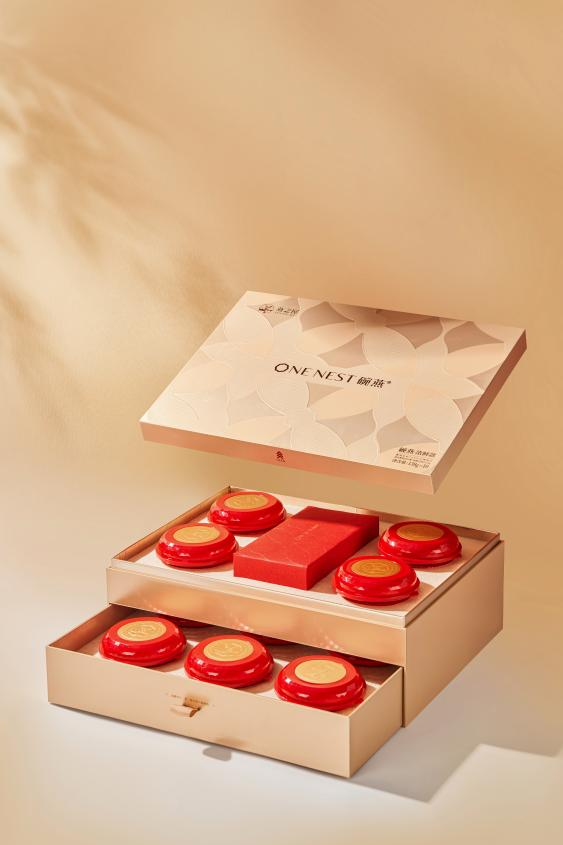 碗燕·濃鮮款為高品質(zhì)生活而匠心打造,盛器與禮盒設(shè)計(jì)亦不失高貴,儀式感滿滿。禮盒采用尊貴典雅的香檳金色調(diào),給人眼前一亮的高級感。盒蓋選用燕之屋LOGO中的花瓣型進(jìn)行延展,簡約耐看,寄予“綻放”的美好寓意。禮盒內(nèi)紅金搭配的精巧小碗同樣蘊(yùn)藏巧思,碗蓋以鉆石型設(shè)計(jì),與燕窩的珍貴滋養(yǎng)相契合,別具一格。碗蓋一側(cè)設(shè)計(jì)手捏“小耳朵”,開蓋不卡頓,指尖不費(fèi)力,還你優(yōu)雅好姿態(tài)。碗內(nèi)更有一層金屬易撕膜,可減少碗內(nèi)間隙空間,更好保護(hù)燕窩條狀,而且輕撕超順滑,燕窩不易撒漏,滋養(yǎng)不再浪費(fèi)。此外,為滿足不同滋養(yǎng)需求,碗燕·濃鮮款特別設(shè)計(jì)兩款禮盒裝,樣樣精致。碗燕·濃鮮款(30碗裝)禮盒以層疊擺放,不占用過多空間,綁帶設(shè)計(jì)可輕松拿取。碗燕·濃鮮款(10碗裝)以上下層抽屜式設(shè)計(jì),拿取產(chǎn)品不費(fèi)勁,優(yōu)雅滋養(yǎng),從容自在。