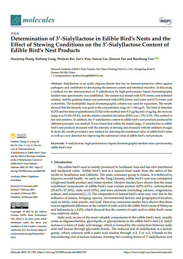 這種高價值的營養(yǎng)成分,是否僅存在于母乳中呢?2023年2月,燕之屋在國際權威期刊《Molecules》在線發(fā)表《Determination of 3'-Sialyllactose in Edible Bird's Nests and the Effect of Stewing Conditions on the 3'-Sialyllactose Content of Edible Bird's Nest Products》。該研究發(fā)現(xiàn),即食燕窩中存在3'-唾液酸乳糖,而且其含量與燉煮工藝密切相關。燕之屋碗燕®所采用的121℃專利燉煮工藝*(*一種易撕蓋包裝容器的食品加工工藝,ZL202111218644.4)使碗燕®(文中批號UK04143)3'-唾液酸乳糖大幅提升至100℃燉煮燕窩的50倍。此項研究證明,燉煮有利于燕窩中的唾液酸向3'-唾液酸乳糖的形式轉化,提升唾液酸的營養(yǎng)價值;相較之下,碗燕®(文中批號UK04143)所采用的121℃專利燉煮工藝*3'-唾液酸乳糖含量相對文中對比的鮮燉燕窩、家庭燉煮燕窩更高。該研究不僅證明了科學燉煮對于燕窩營養(yǎng)具有提升作用,進一步證實了碗燕®產(chǎn)品獨特的營養(yǎng)價值。