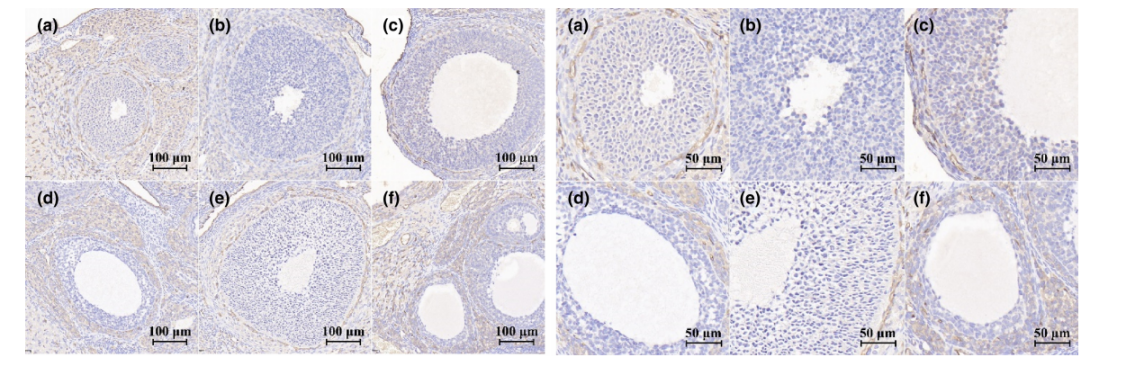 圖:燕窩對卵巢早衰FSHR蛋白表達的影響 (a)正常對照組,(b)模型對照組,