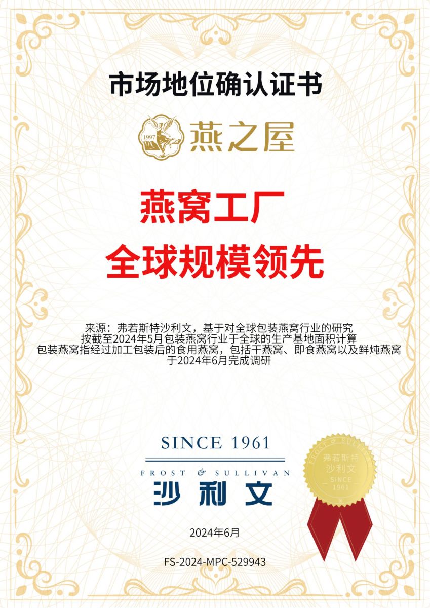 再顯實(shí)力!燕之屋獲沙利文市場(chǎng)地位確認(rèn)證書,燕窩工廠全球規(guī)模第一