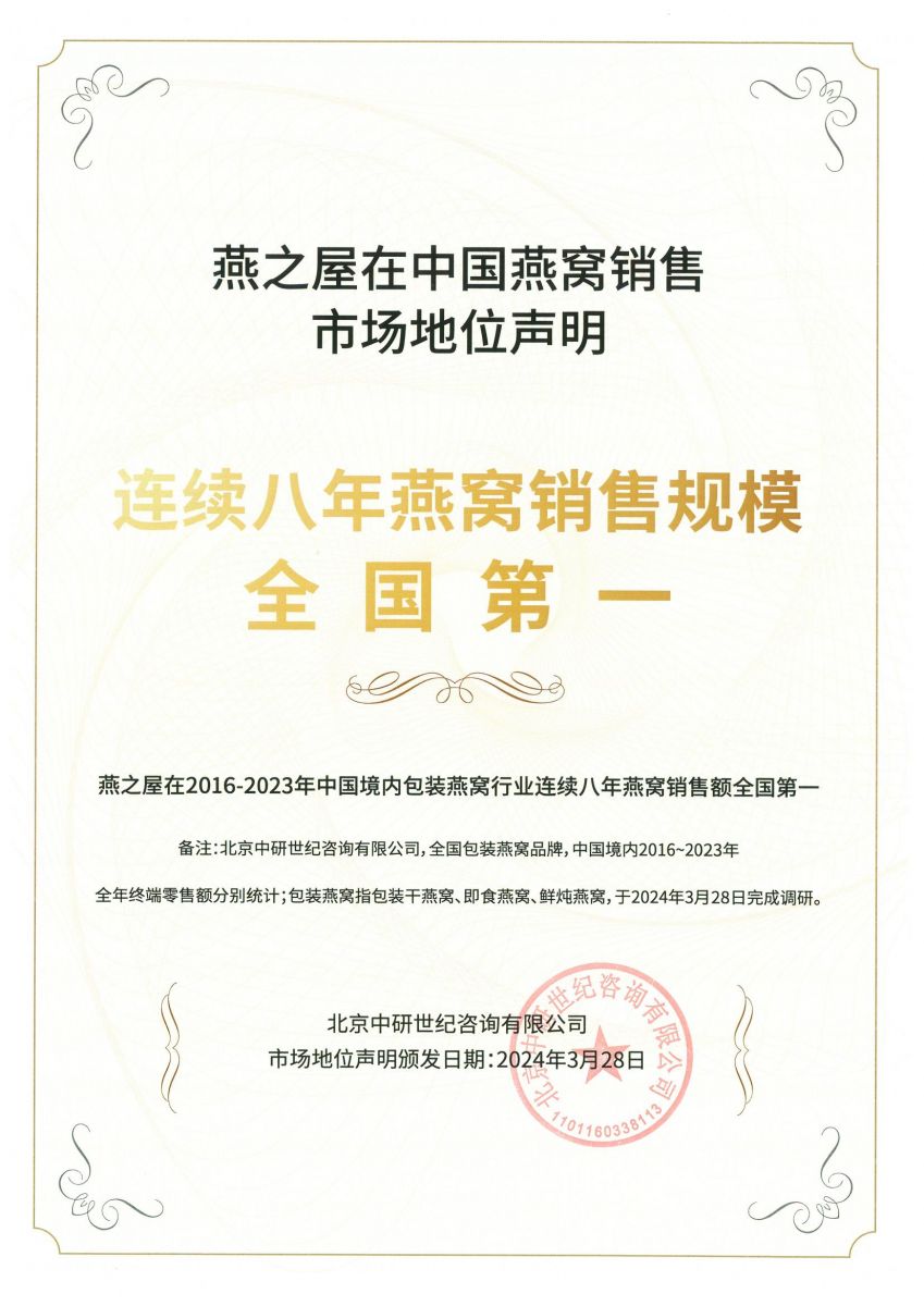 近日,經(jīng)知名咨詢機(jī)構(gòu)弗若斯特沙利文有限公司認(rèn)證,燕之屋獲得燕窩工廠全球規(guī)模第一、燕窩工廠全球規(guī)模領(lǐng)先兩大全球包裝燕窩行業(yè)市場(chǎng)地位確認(rèn)證書。這是繼燕之屋2022年度獲沙利文認(rèn)證燕窩工廠規(guī)模全國(guó)最大、全國(guó)領(lǐng)先證書后的又一重大突破。從全國(guó)第一到全球第一,燕之屋步步為營(yíng),憑卓越實(shí)力增強(qiáng)企業(yè)競(jìng)爭(zhēng)力,持續(xù)引領(lǐng)行業(yè)高質(zhì)量發(fā)展。