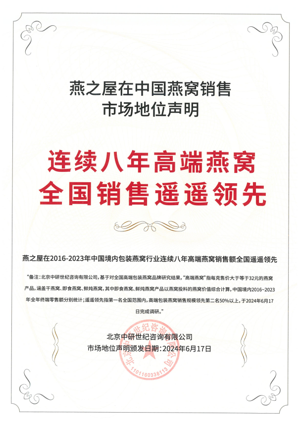 近日,根據(jù)北京中研世紀咨詢有限公司統(tǒng)計顯示,燕之屋連續(xù)八年高端燕窩全國銷售第一*(*燕之屋在2016-2023年中國境內(nèi)包裝燕窩行業(yè)連續(xù)八年高端燕窩銷售額全國第一)、燕之屋連續(xù)八年高端燕窩全國銷售遙遙領先*(*燕之屋在2016-2023年中國境內(nèi)包裝燕窩行業(yè)連續(xù)八年高端燕窩銷售額全國遙遙領先),不僅體現(xiàn)了燕之屋硬核的產(chǎn)品力和強大的品牌影響力,也證明了其在燕窩行業(yè)的頭部地位。