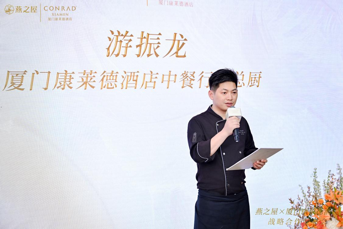 廈門康萊德酒店總經(jīng)理莫永泉也對此次合作滿懷期待,他在致辭中說道:“燕之屋作為一家26年的燕窩專營企業(yè),是中國上市的高品質(zhì)燕窩品牌,擁有廣泛的知名度與美譽(yù)度??等R德品牌成立于1982年,是百年酒店管理公司希爾頓集團(tuán)旗下的奢華酒店品牌,倡導(dǎo)自信、創(chuàng)新與融合,我們的合作一拍即合。我們都知道好的菜品跟主廚的理解、烹飪方法和對食材品質(zhì)的挑剔,缺一不可。燕之屋的燕窩品質(zhì)是首屈一指的,非常榮幸可以有機(jī)會和燕之屋一起研發(fā)菜單。”