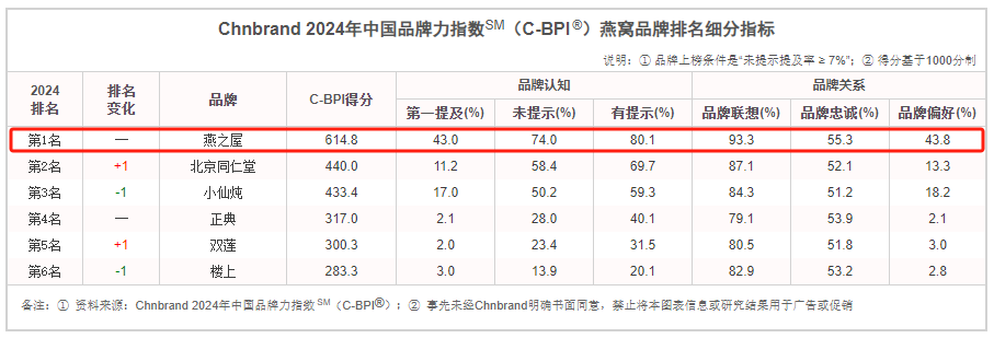近日,2024年中國品牌力指數(shù)SM(C-BPI®)品牌排名和分析報(bào)告重磅發(fā)布,燕之屋以614.8分的優(yōu)異成績,榮登燕窩品牌排行榜榜首。至此,燕之屋已連續(xù)五年問鼎中國品牌力指數(shù)SM(C-BPI®)燕窩品類榜首。