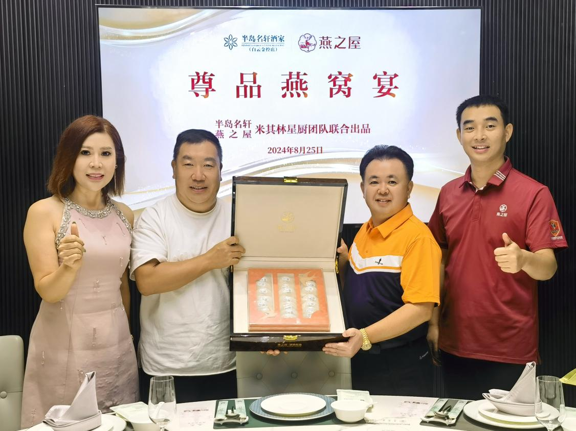 《米其林指南》是世界權(quán)威的美食指南之一,被評為米其林餐廳意味著卓越的品質(zhì)和服務(wù)。尊品燕窩宴菜單由半島名軒酒家(白云金控店)米其林星廚團(tuán)隊匠心定制,從食材到烹飪,從擺盤到成型,星廚嚴(yán)格把控細(xì)節(jié),意在為高品位人士帶來絕妙的美食盛宴。尊品燕窩宴以燕窩為媒,輔以時令食材,天然珍饈與粵式海味相得益彰,完美呈現(xiàn)中式滋補(bǔ)魅力,讓綿延千年*的中式滋補(bǔ)文化璀璨綻放(*“早在唐代我國就已用瓷器與北婆羅洲大尼亞巖洞所產(chǎn)的燕窩進(jìn)行物對物的交換,交換品也成為了宮廷的御用珍品。”《藥物與人》August 2000(Vol13)P349)。當(dāng)天,前菜-山莓戀燕,湯品-荷塘燕影,主菜-比翼雙飛燕、5J腿蓉燕窩扒雙蔬、陳皮燕窩和牛,主食-燕窩燒賣皇、桶仔燕窩撻,甜品-香檸杏汁官燕撈陸續(xù)上桌,組成一席金秋尊品燕窩宴,為在場人員帶來多重感官享受的用餐體驗,收獲在場人員的一致好評。