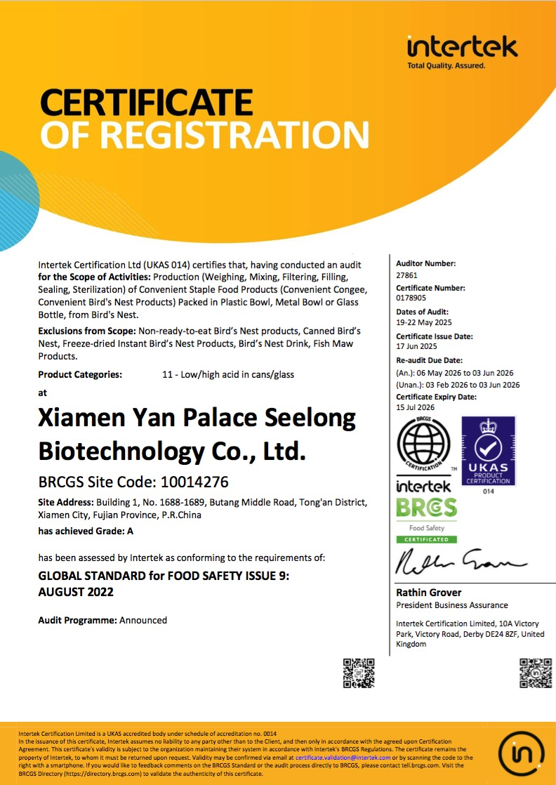 隨著“健康中國”戰(zhàn)略的深入推進(jìn),健康產(chǎn)業(yè)迎來前所未有的發(fā)展機(jī)遇。燕之屋深耕燕窩行業(yè),在健康產(chǎn)業(yè)賽道篤定前行,以高品質(zhì)鑄就卓越品牌,成為中國乃至全球燕窩行業(yè)率先獲得BRC食品安全全球標(biāo)準(zhǔn)、IFS國際食品標(biāo)準(zhǔn)雙重認(rèn)證的燕窩品牌④ 。這些國際認(rèn)可的取得,彰顯了燕之屋對(duì)品質(zhì)的堅(jiān)守,也為中國滋補(bǔ)品贏得了國際聲譽(yù)。