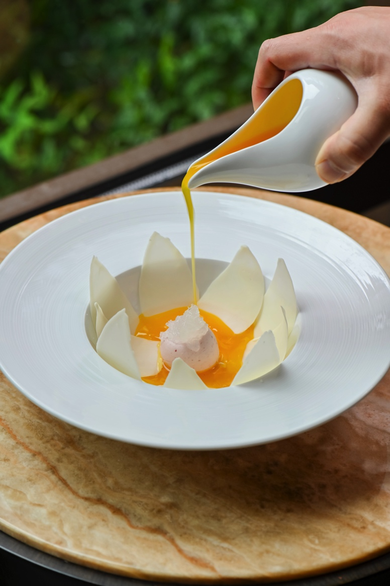 玉蘭花開映燕盞,是一道展現廚藝美學的匠心之作。白巧克力制成花瓣,包裹草莓慕斯花心,在溫潤芒果汁液的澆淋下仿若漸次綻放。燕窩藏于花蕊,細膩口感與靈動形態(tài)共同演繹出食境合一的東方意境。